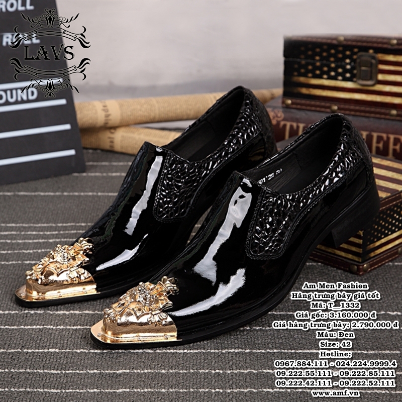 T_1332 sở hữu thiết kế mũi kim loại họa tiết hoàng gia sang trọng – tạo điểm nhấn mạnh mẽ cho phong cách quý ông. Da bóng gương nổi bật, dáng giày thon gọn giúp tôn dáng và tạo hiệu ứng cao cấp ngay khi xuất hiện.